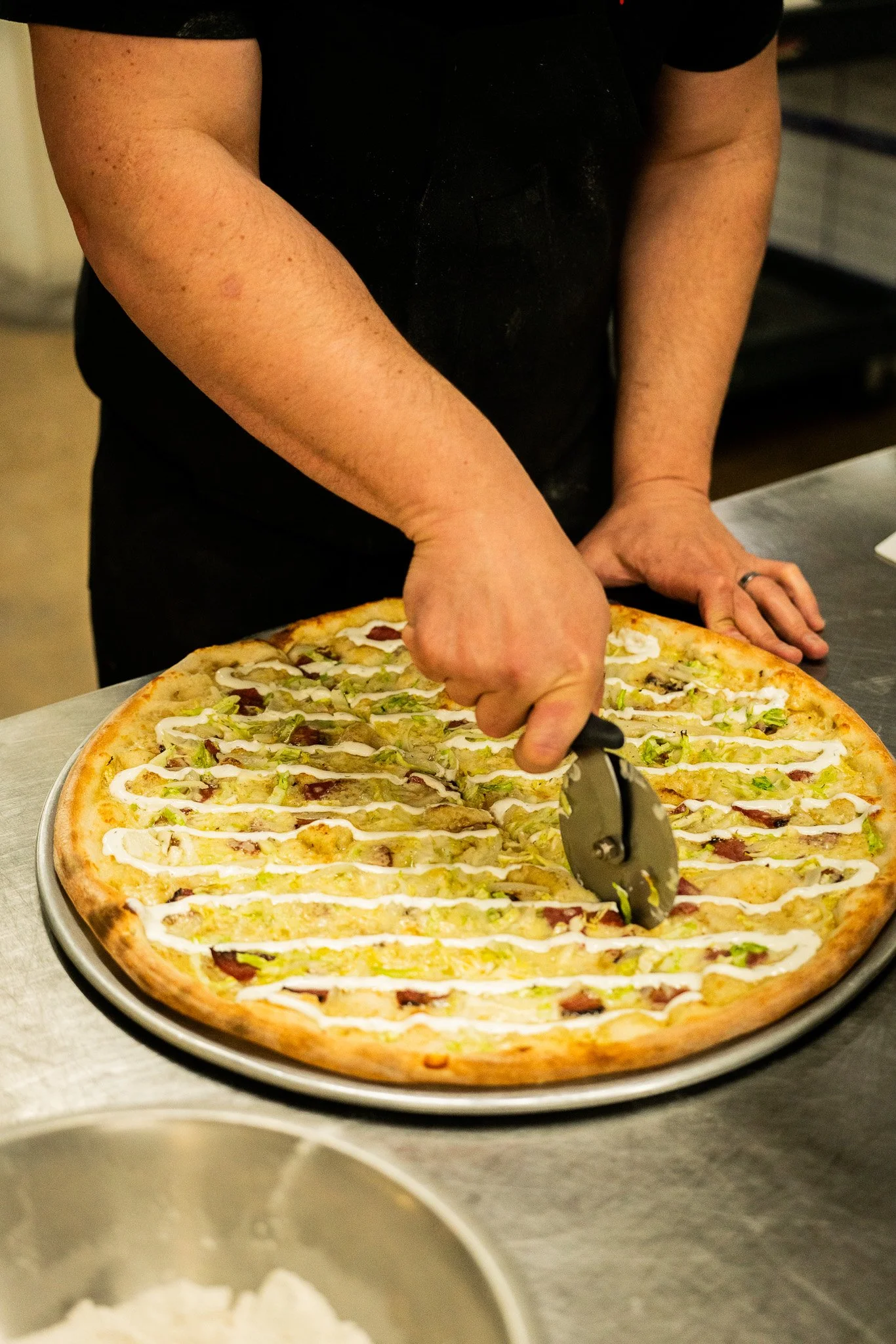 THE DUDE: Ranch base, mozzarella, chicken, bacon, cheddar, flaming hot cheeto dust.